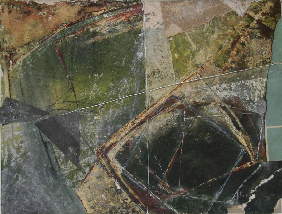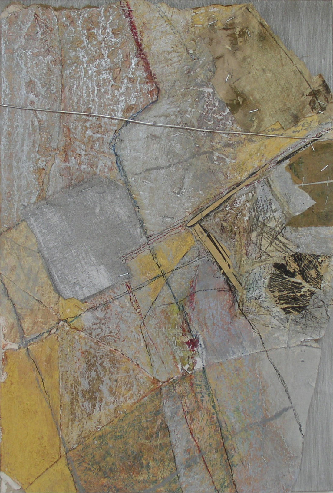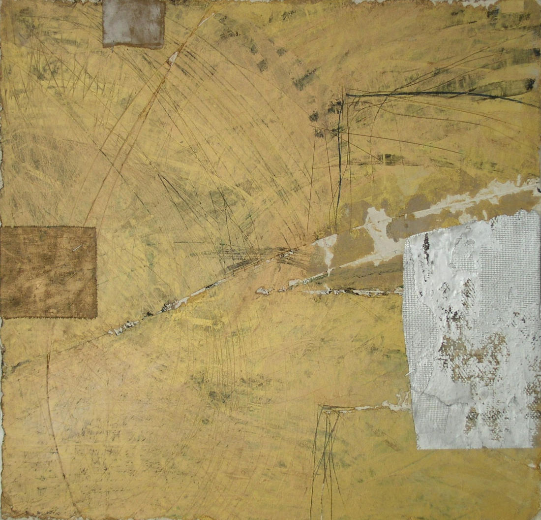 PAINTING WITH BALING WIRE, 21 x 14 - Mixed media on sheetrock BASIC VERTICAL MOUSE NEST, 20 x 20 - Mixed media on sheetrock PAINTING WITH SMALL SILVER NEST PARTS, 15 x 16 - Mixed media on sheetrock PAINTING WITH PARTIAL WIRE MESH, 14 x 20 - Mixed media on sheetrock MINIMALLY REPAIRED GOLD SQUARE, 13 x 12 - Mixed media on sheetrock HEART OF THE BROKEN PAINTING, 12 x 12 - Mixed media on sheetrock Home Paintings Sculpture Mixed Media Installations Statement Resume Contact