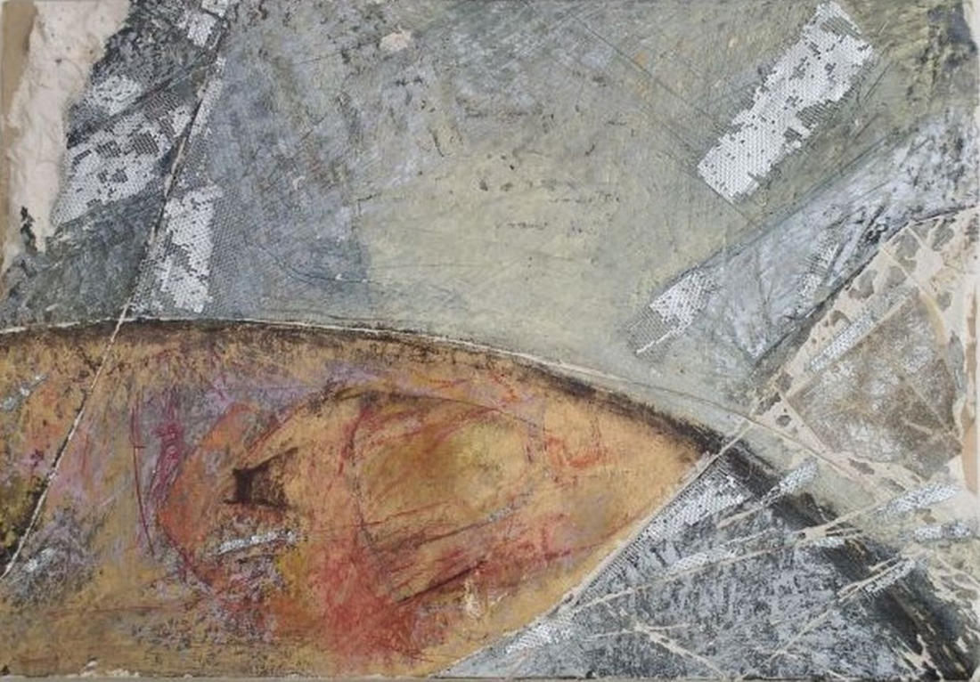 PAINTING WITH TRUNCATED REPAIR, 15 x 21 - Mixed media on sheetrock PAINTING WITH CRACKS, 15 x 20 - Mixed media on sheetrock PAINTING WITH MINOR CRACKS, 15 x 17 - Mixed media on sheetrock VERTICAL MOUSE NEST WITH MIRROR, 20 x 20 - Mixed media on sheetrock